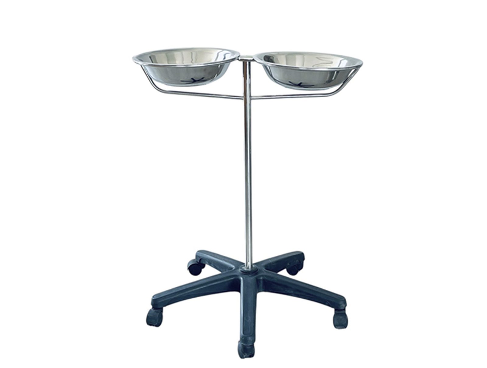 Mounted on a vertical stand with a height of 75 cm, the Double Hand Washing Dish is ergonomically positioned for easy access without the need for bending, making it ideal for busy healthcare facilities. The stand is equipped with four wheels for superior mobility, two of which are fitted with brakes to ensure stability when in use.
